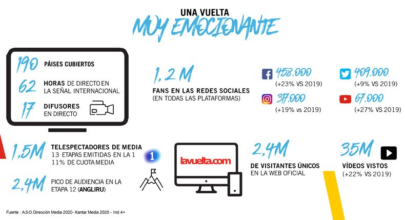 Además, 1,2 millones de aficionados siguieron en las redes sociales la prueba: la cuenta de Facebook de La Vuelta contó con 458.000 seguidores (+23% respecto a 2019); Twitter, 409.000 (+9%); Instagram, 317.000 (+19%) y el canal de Youtube, 67.000 (+27%). La web oficial de La Vuelta tuvo 2,4 millones de visitantes únicos durante la carrera, y se vieron 35 millones de vídeos de la misma.