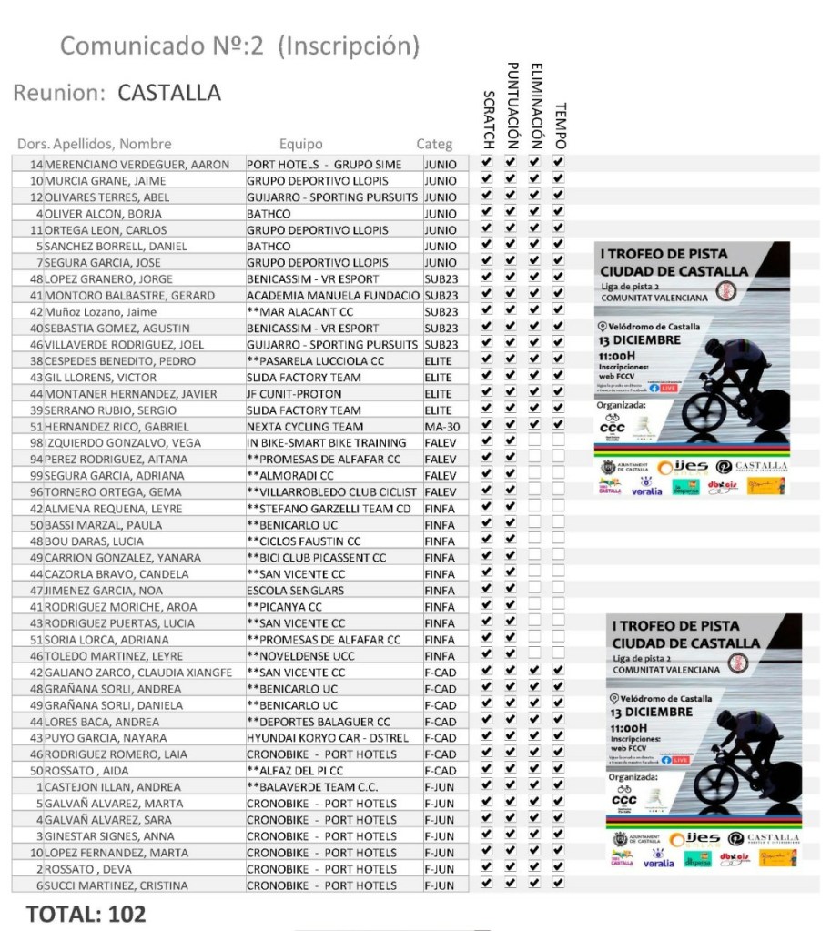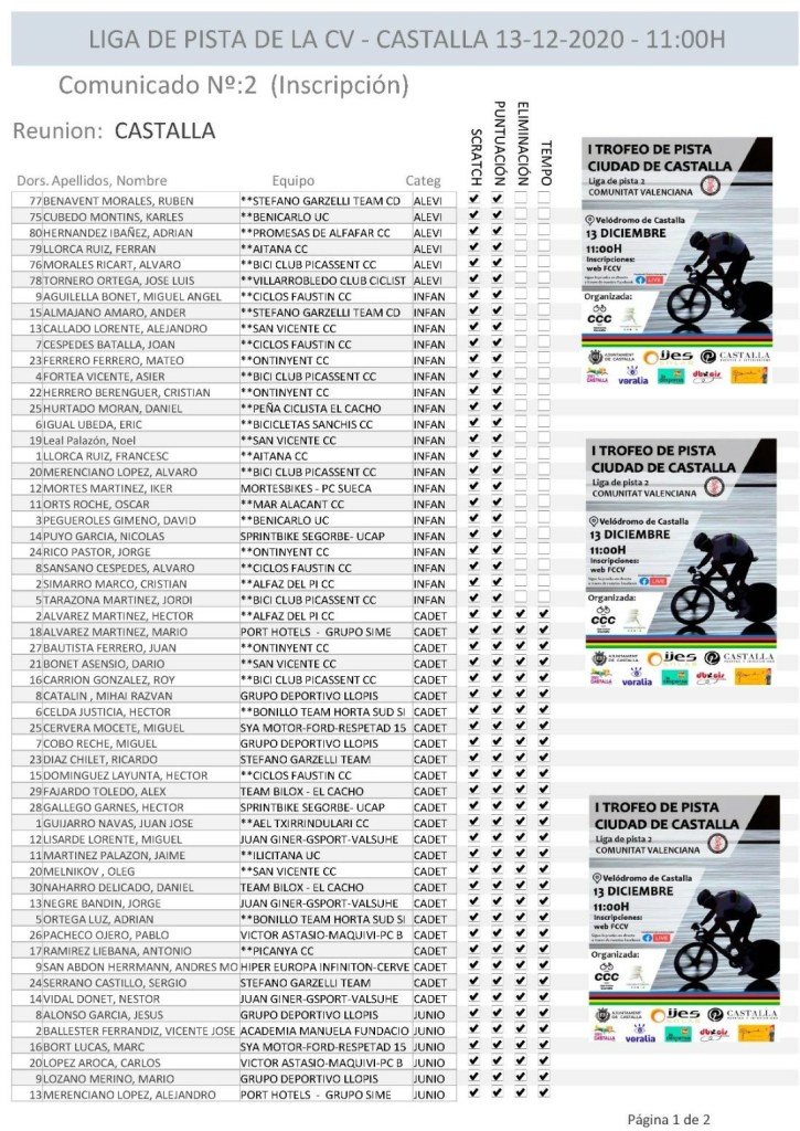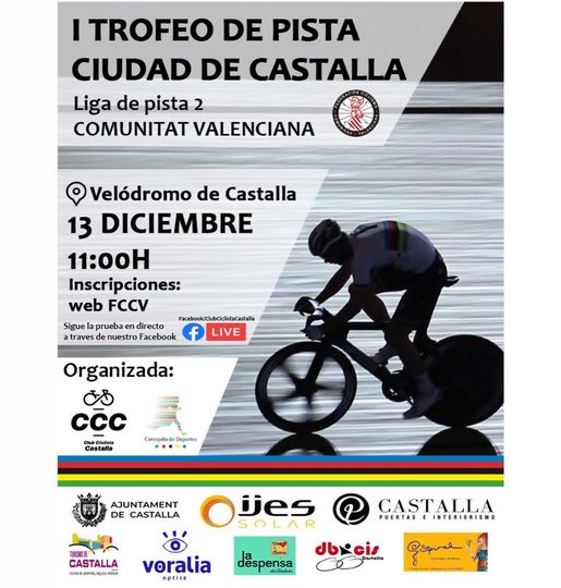 El velódromo municipal de Castalla acogerá el domingo 13 de diciembre, a partir de las 11 horas, la segunda prueba de la Liga de Pista de la Comunidad Valenciana. El I Trofeo de Pista Ciudad de Castalla contará con 102 participantes y la ilusión de la afición alicantina de volver a ver una competición en el citado recinto. Han pasado nada menos que 14 años, desde el 26 de marzo de 2006, que el velódromo no se abría para una competición oficial. Está vez, el Omnium (4 pruebas por categoría) y las de Scratch y Puntuación para alevines e infantiles llenan el programa de competición diseñado por el Club Ciclista Castalla. El I Trofeo de Pista Ciudad de Castalla será retransmitido en directo a través de Facebook.