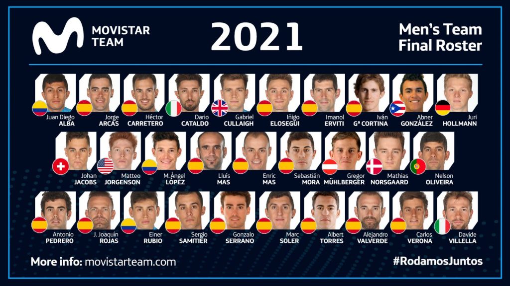 Movistar Team masculino 2021: Juan Diego Alba (COL), Jorge Arcas (ESP), Héctor Carretero (ESP), Dario Cataldo (ITA), Gabriel Cullaigh (GBR), Iñigo Elosegui (ESP), Imanol Erviti (ESP), Iván García Cortina (ESP), Abner González (PUR), Juri Hollmann (GER), Johan Jacobs (SUI), Matteo Jorgenson (USA), Miguel Ángel López (COL), Lluís Mas (ESP), Enric Mas (ESP), Sebastián Mora (ESP), Gregor Mühlberger (AUT), Mathias Norsgaard (DEN), Nelson Oliveira (POR), Antonio Pedrero (ESP), José Joaquín Rojas (ESP), Einer Rubio (COL), Sergio Samitier (ESP), Gonzalo Serrano (ESP), Marc Soler (ESP), Albert Torres (ESP), Alejandro Valverde (ESP), Carlos Verona (ESP), Davide Villella (ITA).