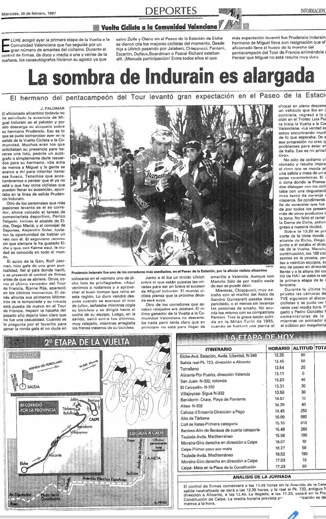 El Ayuntamiento de Elche, desde la Concejalía de Deportes y con la colaboración de Visitelche, está trabajando para que Elche, en el mes de febrero, sea el escaparate mundial del ciclismo como lo fue en aquel inicio de año de 1997.