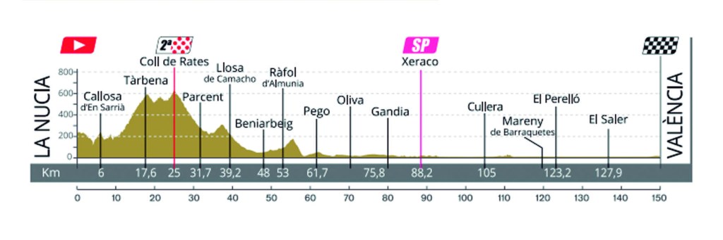 Los ciclistas partirán de La Nucia en dirección a Callosa d’En Sarrià y Bolulla, desde donde enfilarán el Coll de Rates por su vertiente de Tárbena de 14’2 km, hasta los 628 metros de altitud. Desde la cima de Segunda Categoría, en el km 25, la carrera afrontará un descenso pasando por Parcent, Alcalalí, Llosa de Camacho, Pedreguer, Beniarbeig, Ràfol d’Almunia y Pego. A partir de entonces, en el km 70 carrera, la carrera dejará la provincia de Alicante y se adentrará en la de Valencia por Oliva. Los ciclistas tendrán por delante 80 km totalmente llanos en los que los equipos tratarán de reincorporar al pelotón y proteger al máximo a sus hombres rápidos pensando en una hipotética volata final. El único esprint especial de la jornada estará situado en la localidad de Xeraco, en el kilómetro 88. Desde poco antes, concretamente desde Gandía, la carrera discurrirá paralela al mar, por lo que la entrada del viento podría también influir en el desarrollo de la prueba. La afición de Tavernes de la Valldigna, Cullera, Mareny de Barraquetes, El Perelló, El Saler o Pinedo también podrá disfrutar del paso de la caravana ciclista por sus municipios.
