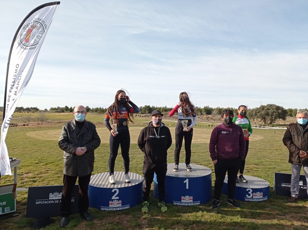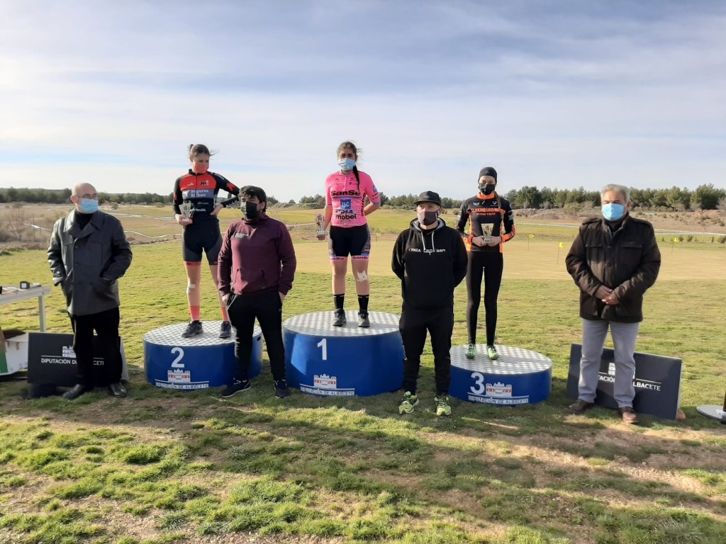 Podio de las ciclistas alicantinas Carla Pérez (Fundación José Sabater) y Selena Maza (ElxEnduro) en el I Ciclocross La Lagunilla que se ha disputado en el campo del Golf La Lagunilla de El Bonillo y que era Campeonato de Castilla y La Mancha. La eldense fue segunda en la categoría cadete, por detrás de Laia Bosch. Valeria Mouro ha sido tercera y la también alicantina Claudia Pérez ha terminado quinta. Ha notado en exceso el esfuerzo realizado en la prueba que se adjudicó en Madrid. Por su parte, Maza, ha sido tercera en la categoría júnior, por detrás de Noelia Ortíz (Sanse) y Naia Arregui (Seguros Bilbao). Las tres esperan estar en la lista de la selección autonómica que acuda en enero a disputar en Torrelavega el Campeonato de España.