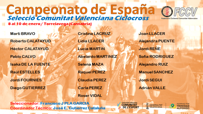 Francisco Pla se lleva 25 corredores al Campeonato de España de Ciclocross que se disputa en Torrelavega del 8 al 10 de enero. El seleccionador Autonómico está ilusionado con dejar alto el pabellón de la Comunidad Valenciana en el Nacional y confía en que en las categorías inferiores, cadetes y juveniles, algunos de sus citados pisen el podio, incluso en su parte más alta. El que fuera campeón de España absoluto en 1995, 1998 y 1999 sabe sacar el máximo de sus ciclistas, no en vano ha dirigido también a la selección Española, estuvo durante más de 10 años en el equipo júnior Castillo de Onda y con las féminas en el Sopela Women’s Team. Toda una garantía.