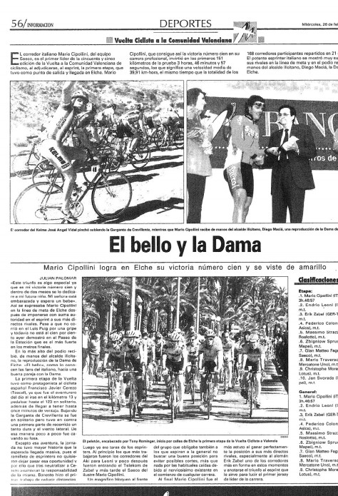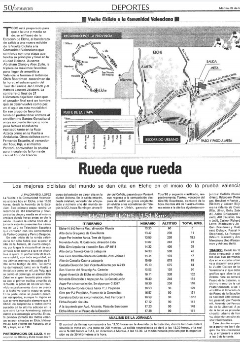 Fue en 1997 cuando se inició por última vez en Elche la ronda valenciana. En aquella ocasión la primera etapa tuvo principio y final en la ciudad ilicitana, tras 151 kilómetrosde recorrido, con triunfo de Mario Cipollini. Fue la victoria número cien el esprinter italiano. Al día siguiente, el pelotón salió de Elche y terminó en Calpe.