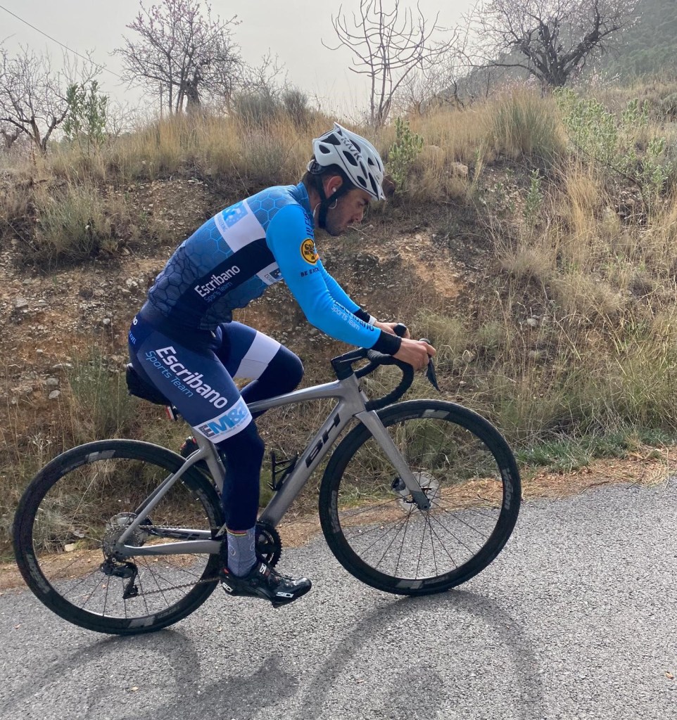 El ciclista alicantino Pedro Beneit ya luce su nuevo maillot, el que ha diseñado esta campaña ULEVEL Sports para el equipo Escribano Sports Team, por las carreteras de la provincia durante sus entrenamientos, al igual que la bicicleta BH, modelo Rs1. “Un auténtico avión, la verdad, porque no tiene cables por fuera del cuadro y es muy aerodinámica”, señala Beneit. Estas son las características que diferencian a la nueva «burra» de la escuadra madrileña: No existen cables a la vista en la BH RS1 gracias al uso del sistema ACR que, además, permite un mantenimiento cómodo y sencillo; el sistema de cierre de sillín tipo cuña, completamente integrado en el tubo superior del cuadro; y el empleo del concepto Kamm Tail, que se traduce en unos tubos con una forma de gota acabada en un corte perpendicular que reduce al máximo las turbulencias y que consigue una alta eficacia aerodinámica.