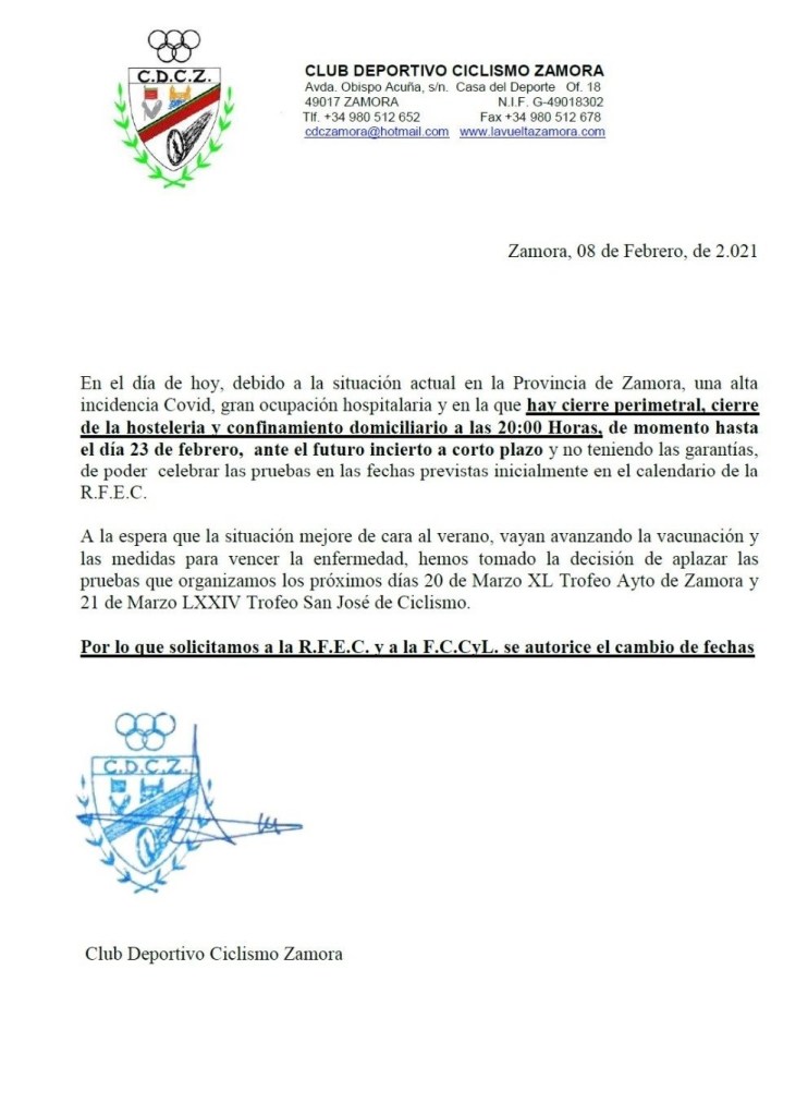 El CDC Zamora ha solicitado a la Federación de Castilla y León y a la Real Federación Española de Ciclismo (RFEC) el aplazamiento de las dos carreras que forman el Díptico Ciclista Zamorano en el mes de marzo: el Trofeo Ayuntamiento de Zamora y el Trofeo San José (antes Iberdrola) ante la actual situación provocada por la pandemia del Covid 19