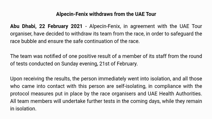 «El equipo fue notificado de un resultado positivo de un miembro de su personal en la ronda de pruebas realizadas el domingo 21 de febrero por la noche. Al recibir los resultados, la persona se aisló de inmediato, y todos los que entraron en contacto con esta persona se aislaron, de acuerdo con las medidas del protocolo implementadas por los organizadores de la carrera y las autoridades sanitarias de los EAU. Todos los miembros del equipo se realizarán más pruebas en los próximos días, mientras permanecen aislados«.