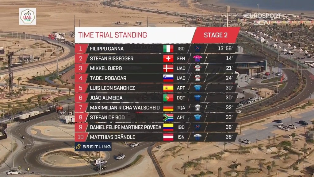 Filippo Ganna (Ineos Grenadiers) ha ganado la segunda etapa del Tour de los Emiratos Árabes Unidos 2021, UAE Tour, una contrarreloj individual de 13 kilómetros disputada en Al Hudayriat Island. El ciclista italiano ha parado el reloj en los 13 minutos y 56 segundos. El suizo Stefan Bissegger (EF Education-Nippo) ha ocupado la segunda plaza y el danés Mikkel Bjerg (UAE Emirates), la tercera. El maillot de líder es ahora del esloveno Tadej Pogacar (UAE Emirates). Luis León Sánchez (Astana), quinto en la crono, ha sido el mejor español.