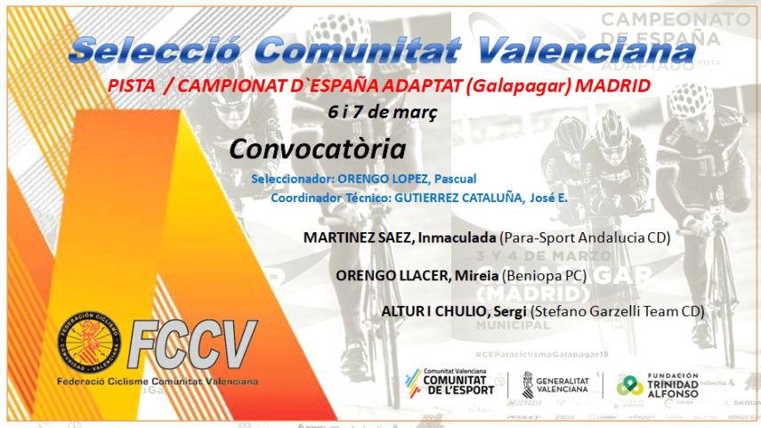 La primera gran cita a nivel nacional de la temporada 2021 de ciclismo adaptado, el Campeonato de España de Pista, tendrá lugar el fin de semana del 6 y 7 de marzo en el Velódromo de Galapagar. El recinto madrileño acogerá un evento que durante la tarde del viernes 5 de marzo disfrutará de sus entrenamientos oficiales y que dará comienzo a las once de la mañana del sábado. Ese día la Persecución Individual y la Velocidad por Equipos de las clases B y C serán las protagonistas; mientras que el domingo se disputarán el Kilómetro CRI de las clases B y C, el Scratch y la Velocidad Individual de la Clase B y obtendremos los resultados finales del Omnium de la clase B. La Selección de la Comunidad Valenciana aportará tres ciclistas, mientras que la almoradidense Melisa Gómiz ejercerá de piloto de la catalana Pepi Benítez.