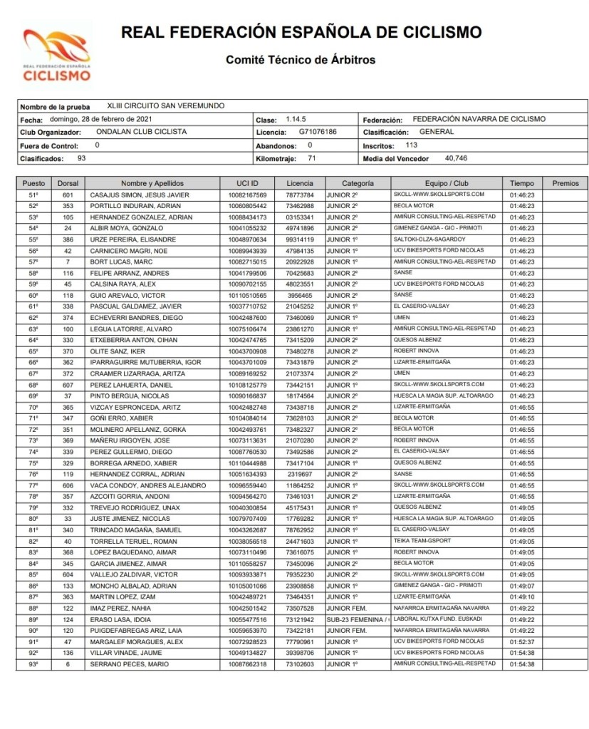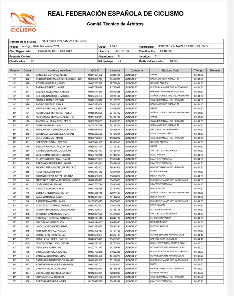 Rubén Sánchez (Sanse) ha sido el vencedor al esprint del XLIII Circuito San Veremundo para corredores júniors disputado esta mañana en Villatuerta. El corredor de la Unión Ciclista San Sebastián de los Reyes ha impuesto su punta de velocidad a un numeroso grupo en un final en pequeña subida donde demostró ser el más fuerte. Buen trabajo del equipo Giménez Ganga que tuvo en la escapada del día a Marc Dolçs. En balear atacó en la parte dura del día, junto a Jaume Villar (Bici Sport). Llegaron a sacar al pelotón unos 40 segundos. Pero, en el llano, los equipos interesados en luchar por la victoria de etapa al esprint anularon la fuga. “Era una locura llegar desde ahí a meta, pero tenía que intentarlo. Tenía pocas posibilidades al esprint, he encontrado esa posibilidad y lo he intentado, pero no ha salido bien. Quizás me he precipitado un poco, pero a veces sale bien, aunque en esta ocasió fue mal. Para ser la primera carrera de la temporada no está mal, las sensaciones han sido buenas. Lástima que en el esprint no hayamos podido colocar a Sergi Amengual”, señalaba al final de la carrera Marc.
