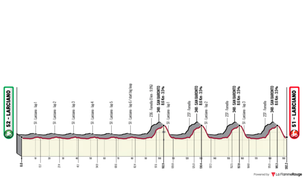 La carrera se disputa alrededor de la ciudad de Larciano, en dos circuitos distintos. Al primero de 22,3 kilómetros habrá que dar cuatro vueltas sin dificultad excesiva. El segundo, en cambio, que se repetirá también durante cuatro vueltas, tiene un recorrido de 27,5 kilómetros e incluye las cuatro subidas del Fornello, para continuar hasta la Cota de San Baronto y el posterior descenso hacia Lamporecchio, para finalmente llegar a la recta final donde se coloca la pancarta de meta.