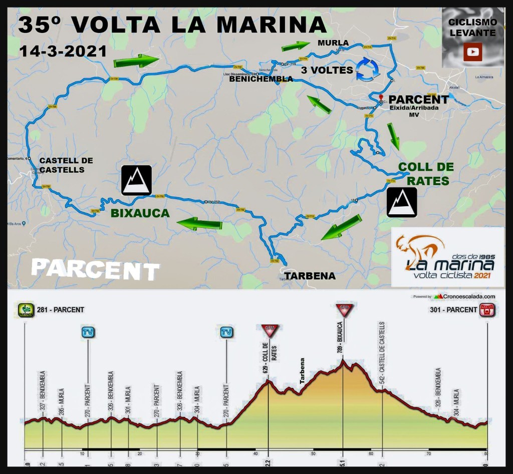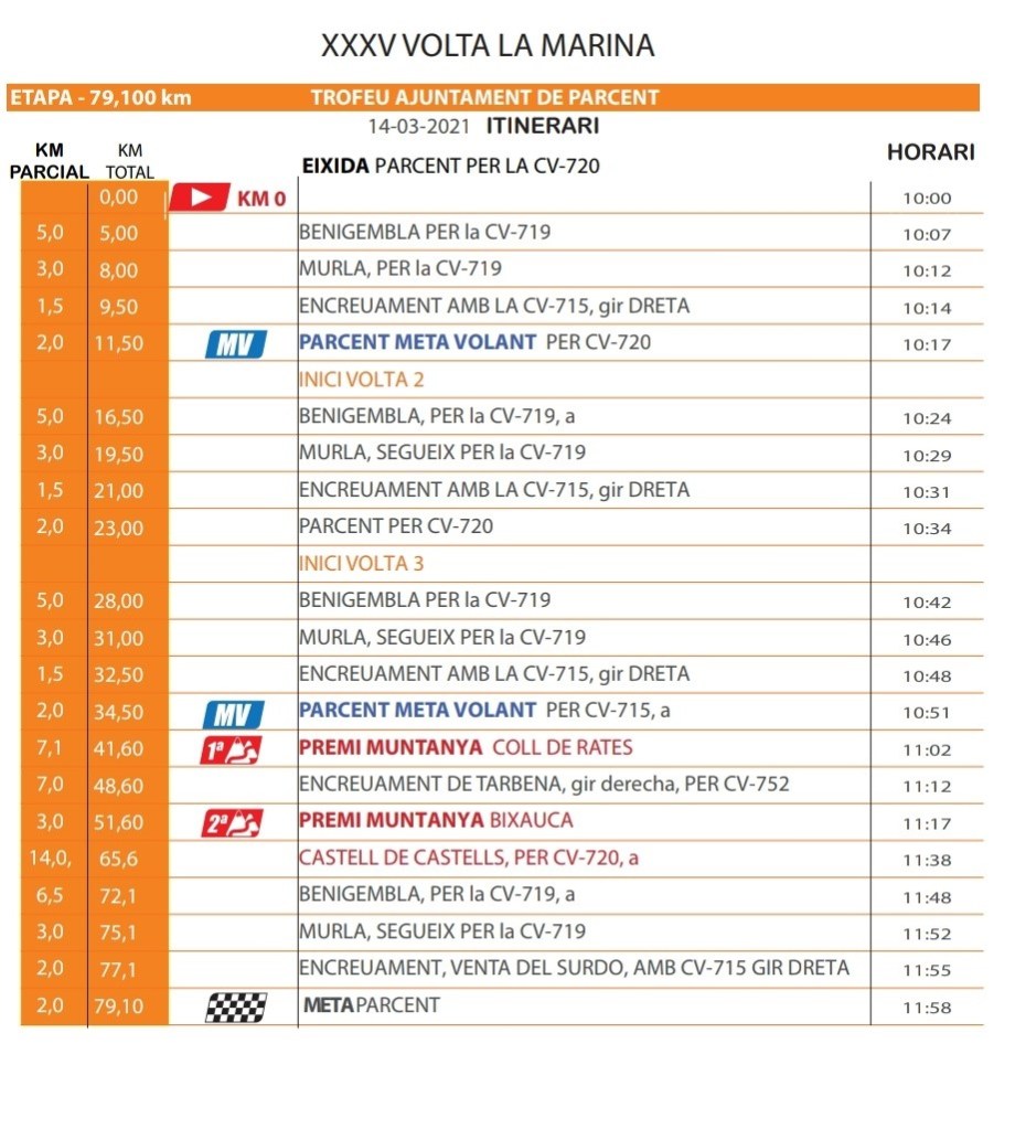 El domingo, 14 de marzo, el pelotón partirá de Parcent a las diez y hará este recorrido: Benigembla, Murla, Parcent (MV), Benigembla, Murla, Parcent, Benigembla, Murla, Parcent (MV), Coll de Rate (PM-1ª), Bixauca (PM-2ª), Castell de Castells, Benigembla, Murla y Pacent (Meta). La llegada está prevista a las 11.58 y los corredores deberán hacer 79,100 kilómetros.