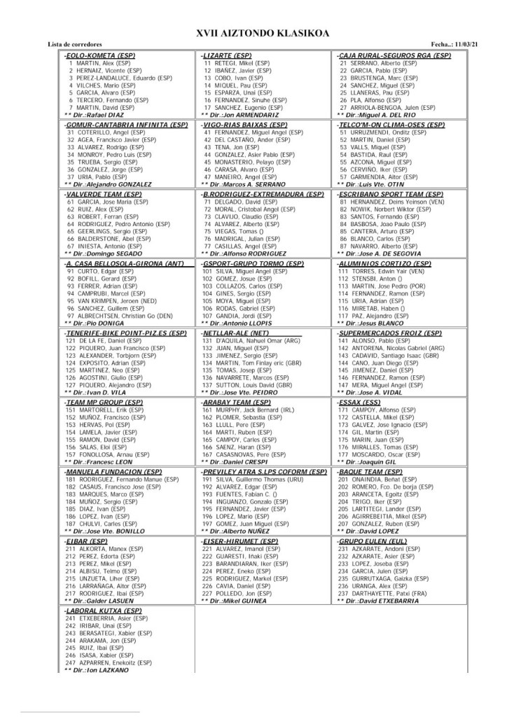 La XVII Aiztondo Klasika-Memorial Patxi Alkorta y las dos primeras pruebas de las Grandes Clásicas-Trofeo Casadevall, que se disputan este fin de semana en Sabadell, el 50 Trofeo Joan Escolà, en la tarde del sábado, y el 91 Campeonato de Sabadell, en la matinal del domingo, marcan la agenda del pelotón élite y sub 23 alicantino. Los conjuntos Netllar Alé y Equipo Essax estarán en los dos frentes. Los alcoyanos partirán en tierras vascas con Nahuel D’ Aquila, Sergio Jiménez, Miguel Juan, Tom Martin, Josep Tomàs, Louis Sutton y Marcos Navarrete. Por su parte, los sajeños saltarán a la carretera con Mikel Castellá, Alfonso Campoy, Nacho Gálvez, Juan Marín, Óscar Moscardó y los alicantinos Martín Gil y Tomás Miralles, que ya se ha recuperado de su fractura de codo y debuta esta temporada, aunque todavía no nivel físico no es el óptimo.