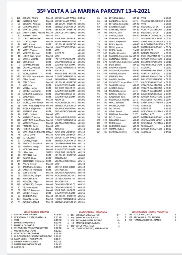 Ambos -Escobar y Arenas- lograron marcharse por delante y abrir hueco respecto a sus perseguidores. El hasta hoy líder, José Carlos Núñez, y el segundo clasificado en la general, Frederic Ivars, poco han podido hacer para parar el empuje de Escobar, que ha logrado una ventaja superior al minuto en meta. En categoría femenina, Cristina Barrajón (Mister Biker – Gobik) ha vuelto a imponerse en Parcent, afianzando su liderato.