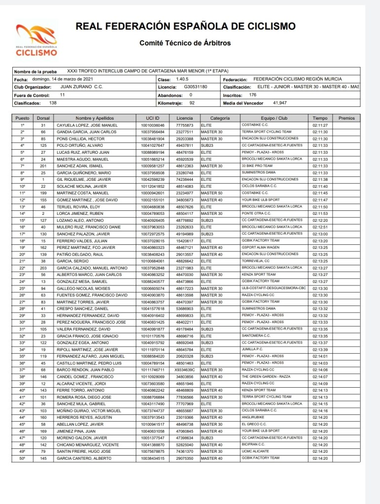 El ciclista de Puerto Lumbreras José Manuel Cayuela, del equipo Costabike, se ha impuesto hoy en la primera etapa del Interclub Campo de Cartagena-Mar Menor 2021, disputada en Lorca sobre un trazado de 91,3 kilómetros. Cayuela ha hecho en meta un tiempo de dos horas, 11 minutos y 27 segundos. A cuatro segundos entraron Juan Carlos Gandía (Terra Sport) y el corredor del Encancon SLU Héctor Pons. A seis del vencedor llegaron Álvaro Polo (Cartagena), Arturo Juan Lucas (Pemoy Plaza 3), Manuel Maestra (Brócoli), Ismael Sánchez y Mario García (Suministros Dama).