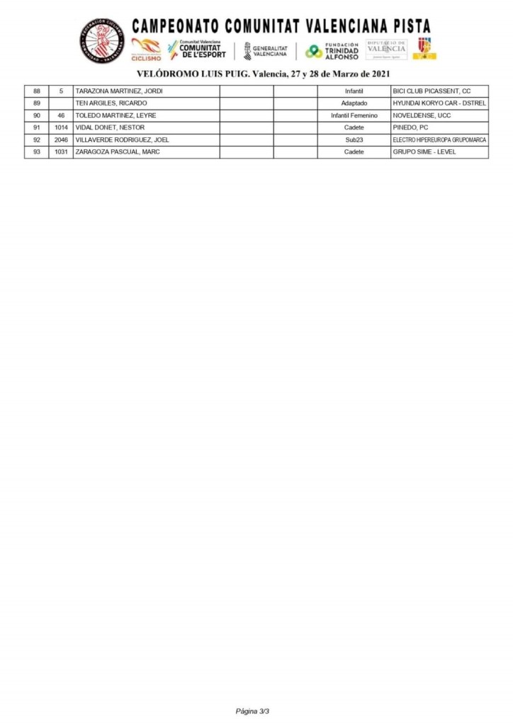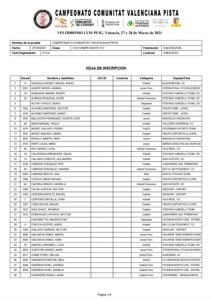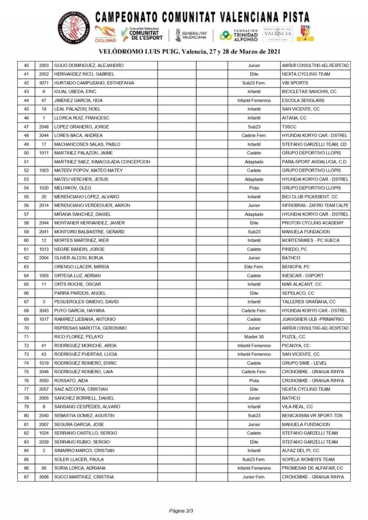El velódromo “Luis Puig” de València acoge este fin de semana el Campeonato de la Comunidad Valenciana Pista después de que el pasado sábado se disputara el de Ómnium en San Vicente. En la lista de inscritos aparecen corredores de las categorías infantil, cadete, júnior, sub 23, élite y adaptado, tanto masculinos como femeninos. Destacar la participación de los sub 23 Raúl Granados (Cartagena), Gerard Montoro (Manuela Fundación), Pedro Beneit (Escribano), Joel Villaverde (Electro Hiper Europa) o Jorge López Granero (T3SCC), además de los élites Javi Carrión (Nexta Cycling), Gabriel Hernández (Nexta Cycling), Javier Montaner (Proton Cycling) o Cristián Sáiz (Nexta Cycling. En féminas, estarán las sub 23 del Natural Greatness Vib Ulb, Melisa Gómiz y Estefanía Hurtado, además de las júniors Marta Galvañ, Cristina Succi, Ainara Albert y Anna Ginestar. El ciclismo adaptado Inma Martínez, junto a Mireia Orengo, competirán en el Kilómetro con la intención de mejorar tiempos con relación al Campeonato de España.
