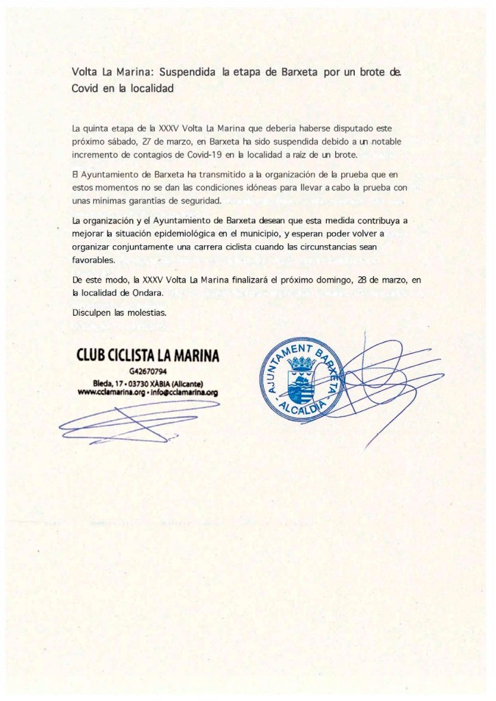 En principio, estaba previsto que la quinta etapa se corriera el sábado en Barxeta, pero ha quedado suspendida por un brote de Covid-19 que ha sufrido la localidad. El Ayuntamiento de Barxeta ha transmitido a la organización de la prueba que en estos momentos no se dan las condiciones idóneas para llevar a cabo la carrera con unas mínimas garantías de seguridad. La organización y el Ayuntamiento de Barxeta desean que esta medida contribuya a mejorar la situación epidemiológica en el municipio, y esperan poder volver a organizar conjuntamente una carrera ciclista cuando las circunstancias sean favorables.
