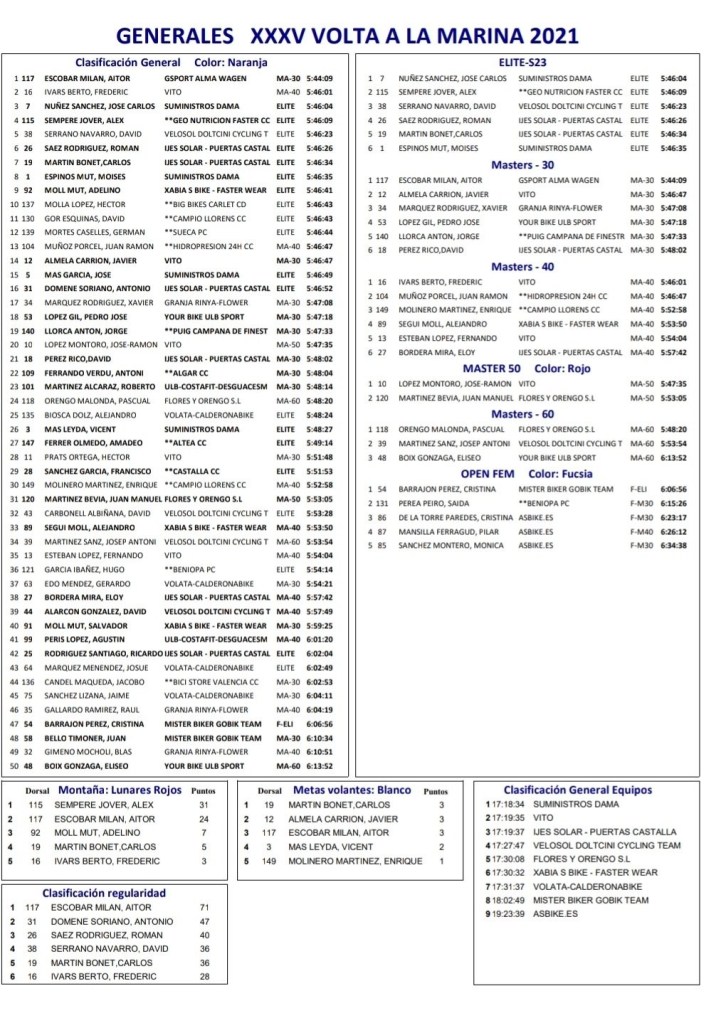 De esta forma, la jornada de Ondara pone el punto y final a esta edición de la Volta La Marina que de momento ha tenido cuatro jornadas, con triunfos parciales de etapa para Ángel Lloret (Pego), Antonio Domene y Álvaro Arenas (Parcent) y Aitor Escobar (Bolulla).