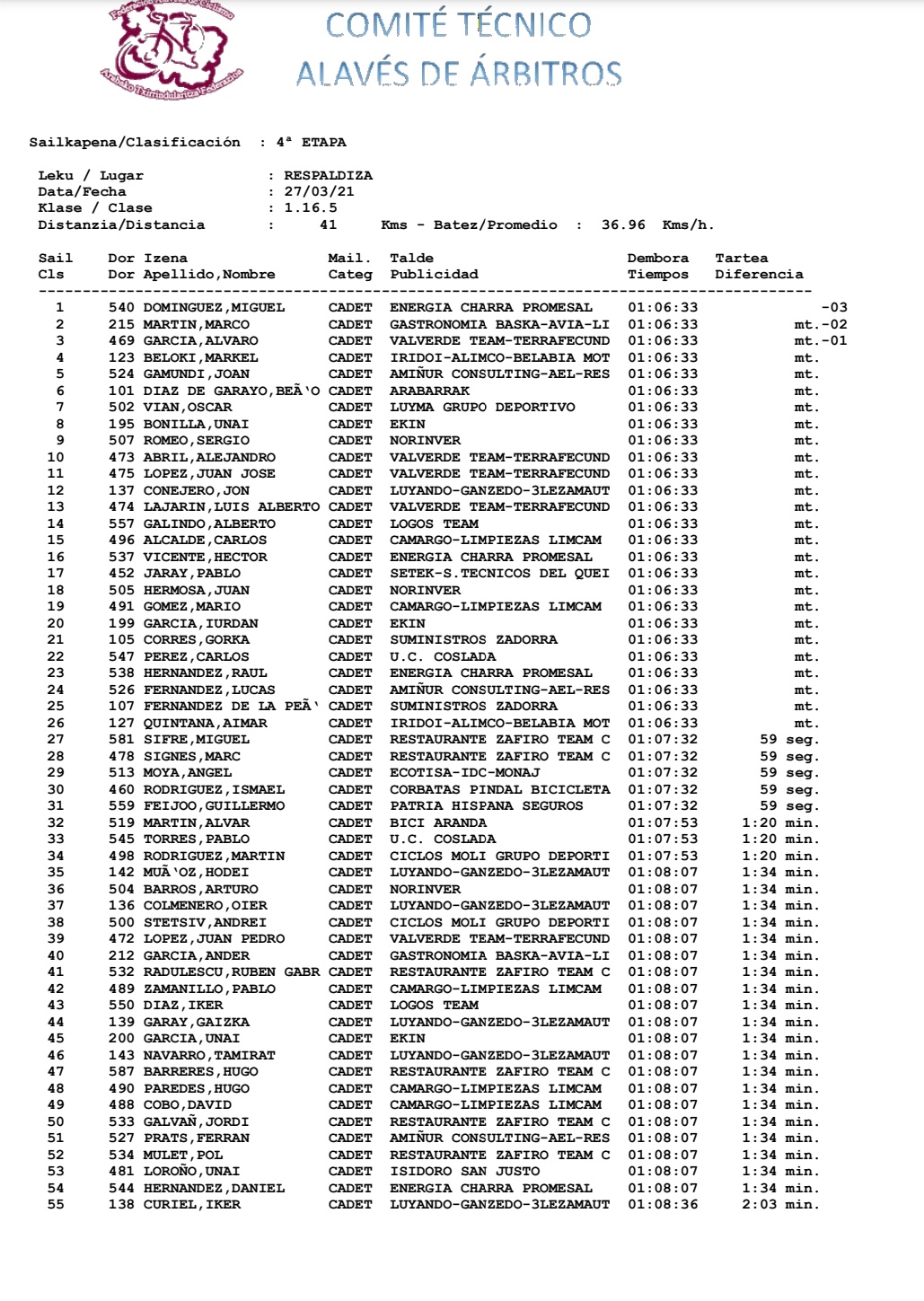Miguel Domínguez (Energía Charra Promesal) se ha adjudicado la cuarta etapa de la Aiarako Bira 2021, con salida y meta en Respaldiza y 41,2 kilómetros de recorrido. Marco Martín (Gastronomía Vasca) ha sido segundo y Álvaro García (Valverde Team-Terra Fecundis), tercero. Buen papel del Restaurante Zafiro Team Calpe en la primera carrera del año. Miquel Sifre y Marc Signes han sido los mejores del equipo calpino. Han estado en el Top 30. «Estoy bastante contento, en general, porque practicamente todo el equipo ha estado adelante bien posicionado e intentando disputar. Por mi parte, muy satsfecho de mi rendimiento en mi primera carrera de la temporada», apuntaba Signes tras la prueba. Algo semejante confesaba su compañero Miquel.