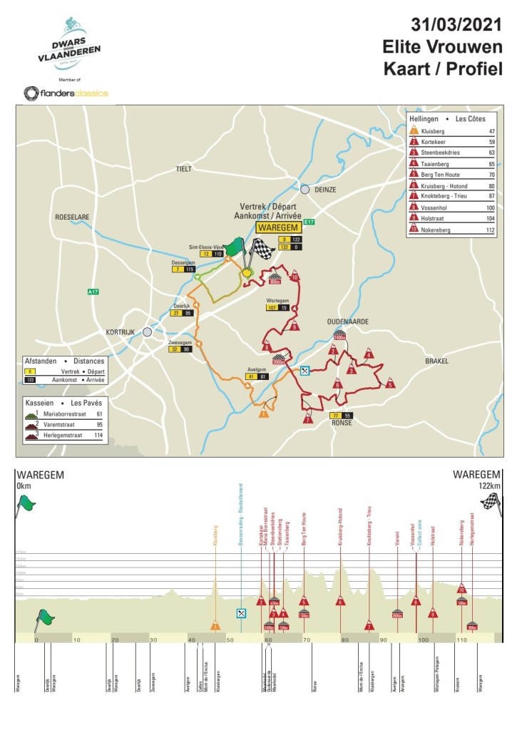 Después de un año de ausencia, llega el momento de volver a la Dwars Door Vlaanderen (A través de Flandes). Ellen van Dijk, vencedora en las dos últimas ediciones, puede igualar a Amy Pieters con una tercera victoria. Hoy se conocerá la ganadora de una dura prueba de 122 kilómetros con salida y llegada en la localidad de Waregem. Se superan siete tramos adoquinados, todos ellos en una segunda mitad de recorrido muy compleja en la que se ascienden, además, diez cotas señaladas como tal por la organización. Las más importantes llegan en los últimos sesenta kilómetros, encadenando Kortekeer, Steenbeekdries y, sobre todo, el Taaienberg (km 65), empinado y estrecho. El Berg Ten Houte (km 70), con sus 1.100 metros adoquinados; las cotas de Kruisberg (km 80) y Knokteberg (km 87); el pavé de Varent (km 95) y el breve Nokereberg (km 112) terminan de seleccionar la lista de favoritas al triunfo.