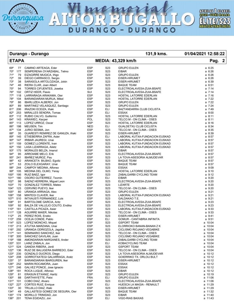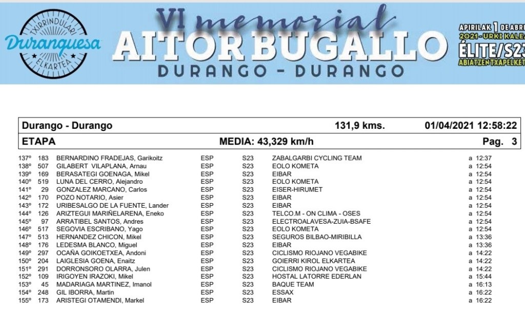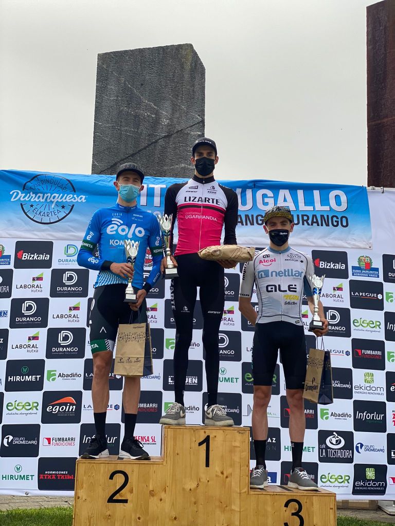Iván Cobo, ganador en Durango, confesó tras bajar del podio: “Cuando Murias (LAB) se fue en la subida final nos tocó ponernos a trabajar. Sinuhé Fernández ha hecho un trabajazo para coger al corredor del Laboral Kutxa y Pau Miquel también. Hemos controlado con bastante autoridad al pelotón y en el esprint final, que picaba para arriba, me he sentido con mucha fuerza y he podido ganar”.