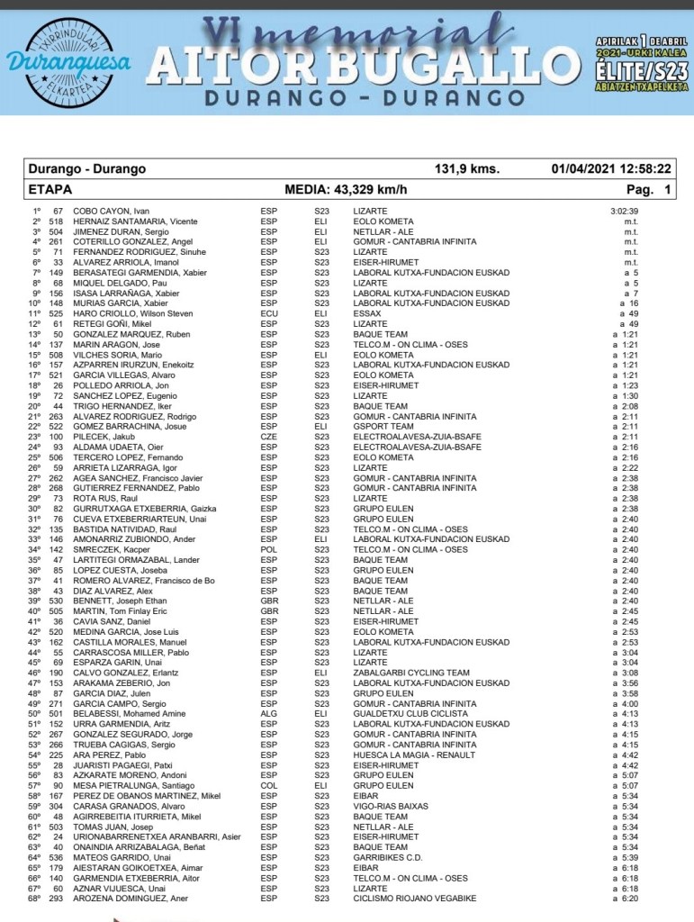 El ciclista sub 23 Iván Cobo (Lizarte Team) ha vencido hoy en el Durangoko Sari Nagusia-Aitor Bugallo Memoriala, de 131,9 kilómetros de recorrido. Cobo se ha impuesto a un grupo de seis corredores que se han disputado el triunfo en la clásica vasca, Vicente Hernáiz (Eolo) fue segundo y Sergio Jiménez logró para el Netllar Alé la tercera posición y subió al podio. “La carrera ha sido rapidísima y en las subidas me encontraba fuerte, siempre en cabeza. En el último puerto nos quedamos un grupo de siete e intenté arrancar desde lejos pero se me hizo largo el sprint y me pasaron al final, pero aún así muy contento y con muchas ganas de lo que viene por delante”, apuntaba el corredor andaluz de la escuadra alcoyana.