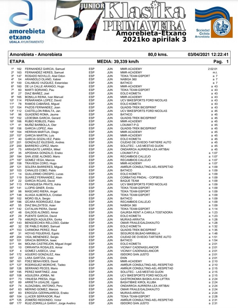 Samuel Fernández García (MMR-Academy) ha sido el ganador de la Klasika Primavera para corredores juveniles disputada esta mañana en Amorebieta. El vencedor ha entrado en meta acompañado de su compañero de escuadra, Samuel Fernández Herez, que han recorrido los 80 kilómetros de la prueba en un tiempo de 2 horas, 12 minutos y 23 segundos. A siete segundos ha llegado el grupo perseguidor que se ha jugado la tercera plaza en el podio al esprint, siendo el más rápido Abel Odón Rosado (Teika Team-Gsport), por delante de Xabier Aransolo (Nabiga 360) y de Estanislao Calabuig (Bathco). A 43 segundos han entrado siete corredores y, a continuación, otro grupo en el que iba el alteano Jaume Guardeño (Bathco), que ha firmado el puesto catorce, a 45 segundos del vencedor. “Lo he probado al principio del puerto, pero me he precipitado. Después, ha arrancado un compañero y yo he entrado con cuatro escapados”, señalaba Guardeño.