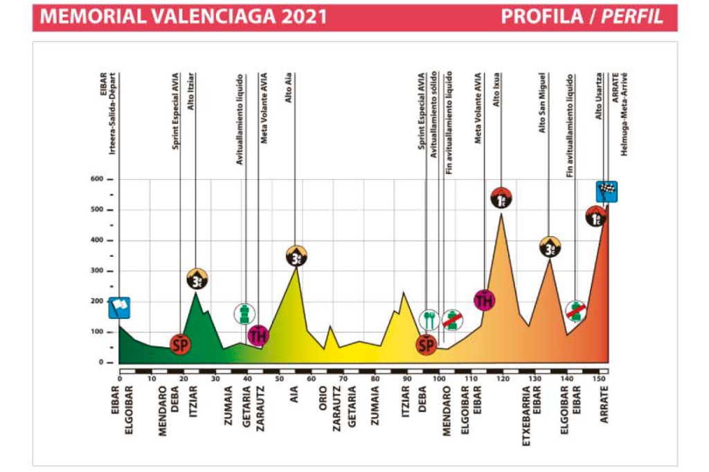 La 50ª edición del Memorial Valenciaga arrancará a las 9:30 h en Eibar, en la Plaza de Untzaga, para encarar un tramo favorable antes de iniciar en la localidad de Deba el primer puerto, el Alto de Itziar de tercera categoría, situado a tan solo 24 kilómetros de la salida. En el kilómetro 55 les espera el Alto de Aia, también de tercera categoría, donde los ciclistas llegarán a través de un bonito recorrido de ida y vuelta junto a las costas del Mar Cantábrico. El Alto de Ixua, de primera categoría y situado a falta de 33 kilómetros de meta, bien podría ser clave para efectuar la selección definitiva, pues nada más terminar su descenso empezará la ascensión al Alto de San Miguel, de tercera, que será el paso previo a la subida final al Alto de Usartza, de primera categoría, y la llegada a Arrate.