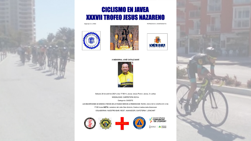 El XXXVII Trofeo Jesús Nazareno-Memorial José Catalá Marí se disputará en Jávea el sábado, 24 de abril. La prueba, reservada para la categoría cadete, se iniciará a las 17 horas y estará organizada por el Club Ciclista Javea. La Federación de Ciclismo de la Comunidad Valenciana (FCCV) ya ha abierto las inscripciones. La carrera contará con 52 kilómetros de recorrido y la meta estará situada en el Cabo San Antonio, junto al restaurante Amanecer.