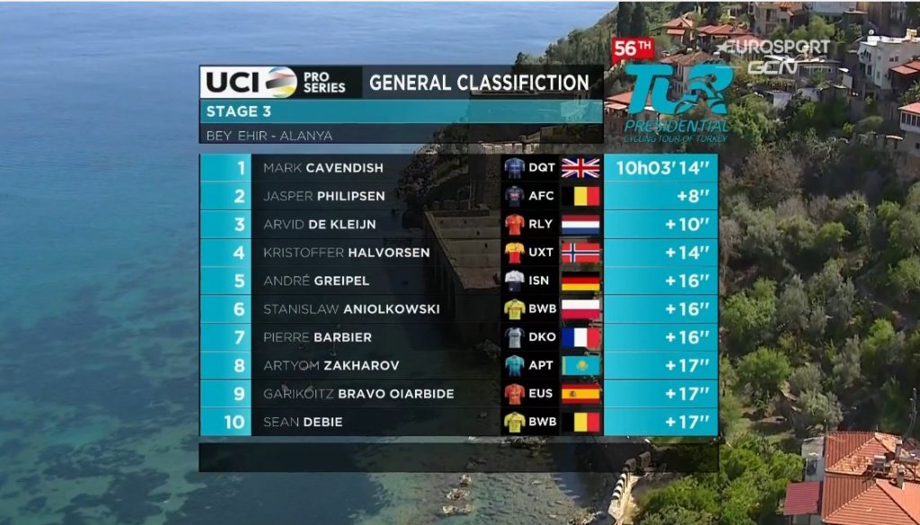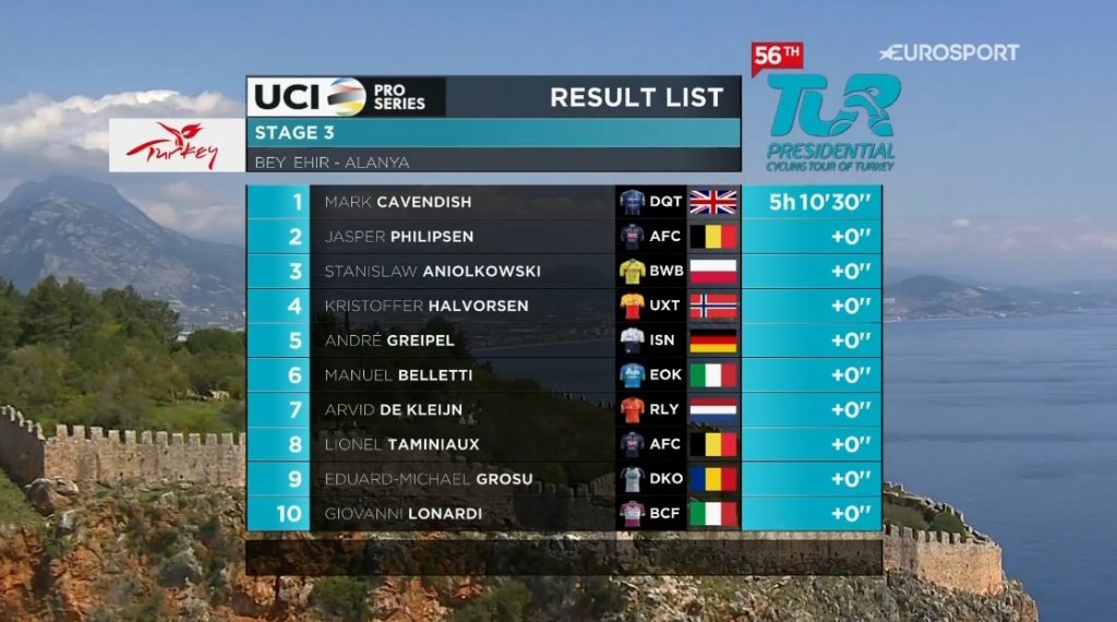 Mark Cavendish (Deceuninck-QuickStep) ha repetido triunfo. Hoy ha ganado la tercera etapa del Presidential Cycling Tour of Turkey (2.Pro), de 212,6 kilómetros, que ha unido Beysehir y Alanya. El lunes, el británico de Deceuninck-Quick-Step consiguió su ansiada victoria y hoy Cavendish volvió a demostrar ser el más rápido. Jasper Philipsen terminó segundo de nuevo, Stanisław Aniołkowski terminó tercero. Sigue con el maillot de líder.