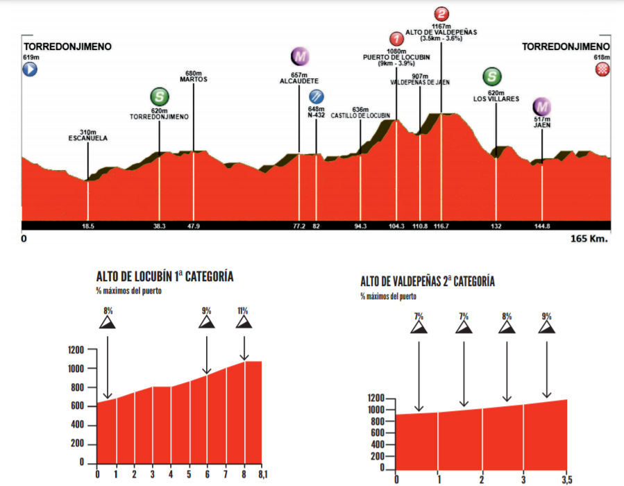 En esta edición 2021, la Clásica Ciudad de Torredonjimeno presentará un trazado muy similar al de años anteriores, con los ascensos al Alto de Locubín, de primera categoría (9 km al 3,9 %), y al Alto de Valdepeñas, de segunda categoría (3,5 km al 3,6%), como puntos claves, pues serán los encargados de efectuar la selección que posteriormente se jugará el triunfo en los 45 kilómetros de terreno favorable que restan hasta llegar a Torredonjimeno.