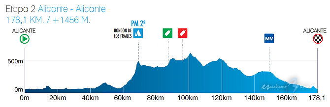 El jueves se disputa la segunda etapa, un recorrido de 178,1 kilómetros con salida y llegada a Alicante. Recorrido con un solo puerto, aunque lejos de meta, zona de repechos a mitad de la etapa con un final rápido. Oportunidad para los ciclistas más rápidos.