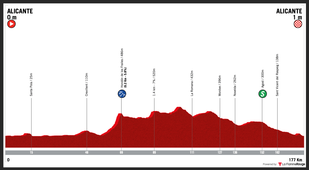 La segunda etapa de la Volta Ciclista a la Comunitat Valenciana 2021 se celebra hoy jueves 15 de abril con salida y llegada a Alicante tras recorrer 179 kilómetros. Se podrá ver por televisión a partir de las 14 horas a través de Eurosport en España, y también en los canales 1 y 2 de Eurosport disponibles en DAZN. Con tan solo un puerto de montaña, el de Hondón de los Frailes, y lejos de meta, todo apunta a que a victoria se decidirá al esprint. Los equipos de velocistas controlarán la jornada.