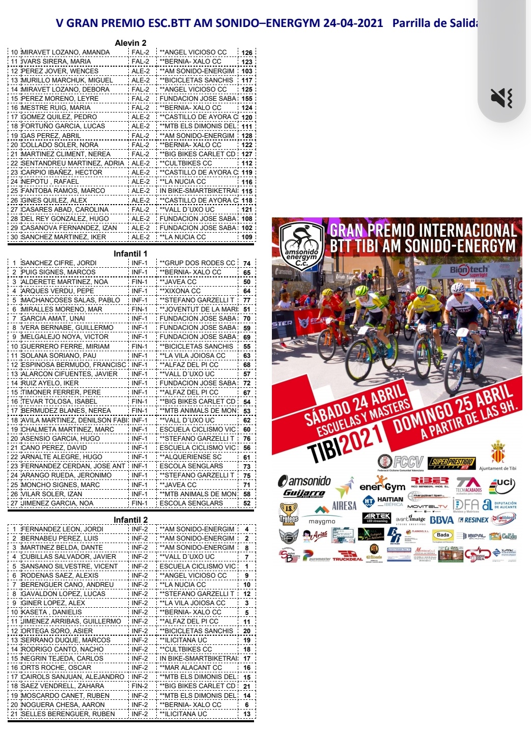 El sábado se disputa en Tibi el V Gran Premio Escuelas BTT AM Sonido-Energym 2021, prueba puntuable para el ranking autonómico de Escuelas de BTT. Será el aperitivo al Superprestigio Faster MTB-V Gran Premio Internacional AM SONIDO – ENERGYM que se celebrará en la localidad alicantina el fin de semana del 24 y 25 de abril del 2021.