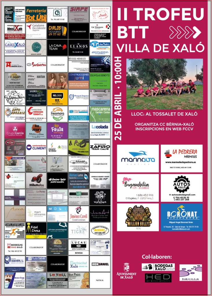 El domingo, día 25, se disputa el II Trofeu BTT ‘Villa de Xaló’ de Escuelas de Ciclismo. La prueba dará comienzo a las 10 horas y estará organizada por el Club Ciclista Bèrnia – Xaló en una circuito diseñado en Al Tossalet. Debido a la pandemia la prueba no se hizo en 2020. El plazo de inscripciones finaliza el jueves a las 20 horas y se espera una gran participación. Está abierto a las categorías masculina y femenina, Promesa 1 y 2, Principiantes 1 y 2, Infantil 1 y 2 y Alevín 1 y 2.