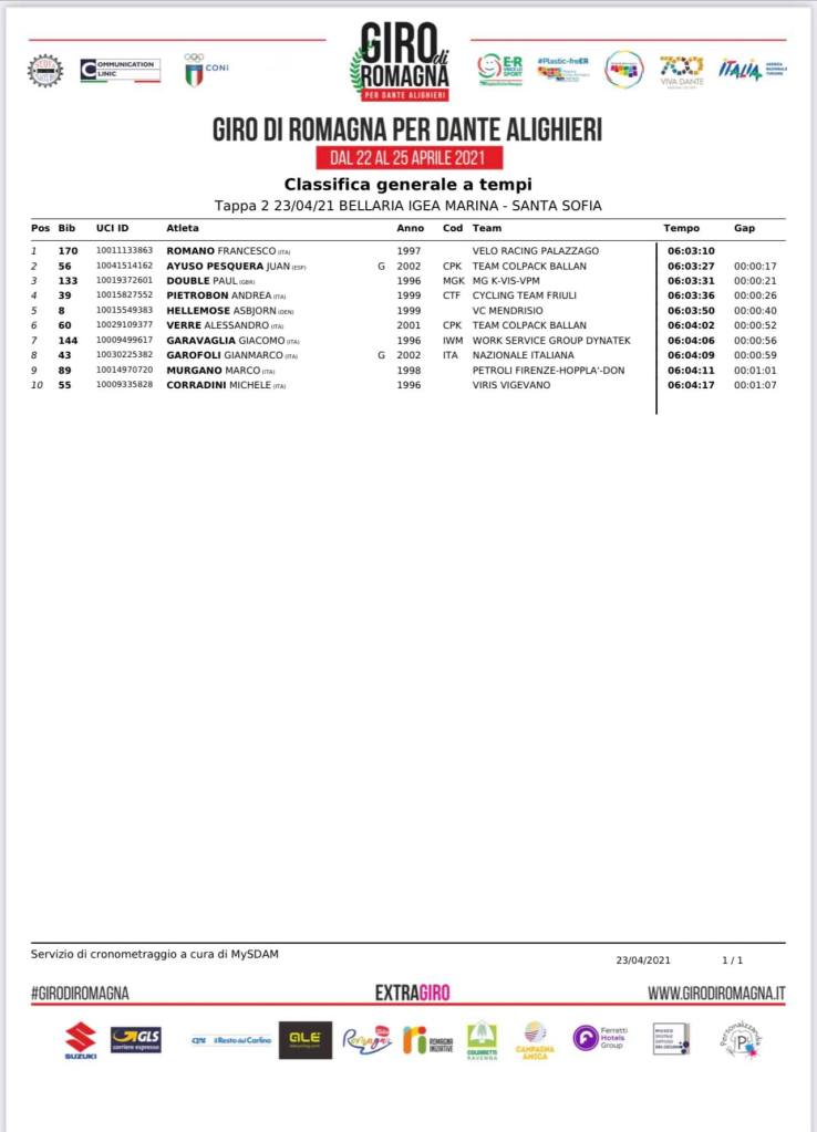 Juan Ayuso (Team Colpack Ballan) ha ganado la segunda etapa del Giro de Romagna en homenaje a Dante Alighieri, que finalizó en Santa Sofía. El pelotón partió de Bellaria y tuvo que recorrer 140,6 kilómetros. En los últimos kilómetros se vivió un bonito duelo entre el líder Francesco Romano (Velo Racing Palazzago) y el corredor alicantino del Colpack Team. Romano fue segundo, Andrea Pietrobon (Cycling Team Friuli), tercero; Pablo Double (MG Kvis), cuarto; y Asbjorn Hellemose (VC Mendrisio), quinto. Es el tercer triufo del xabiense en Italia tras ganar el Trofeo Piva y el Giro del Belvedere, dos de las clásicas de más prestigio.