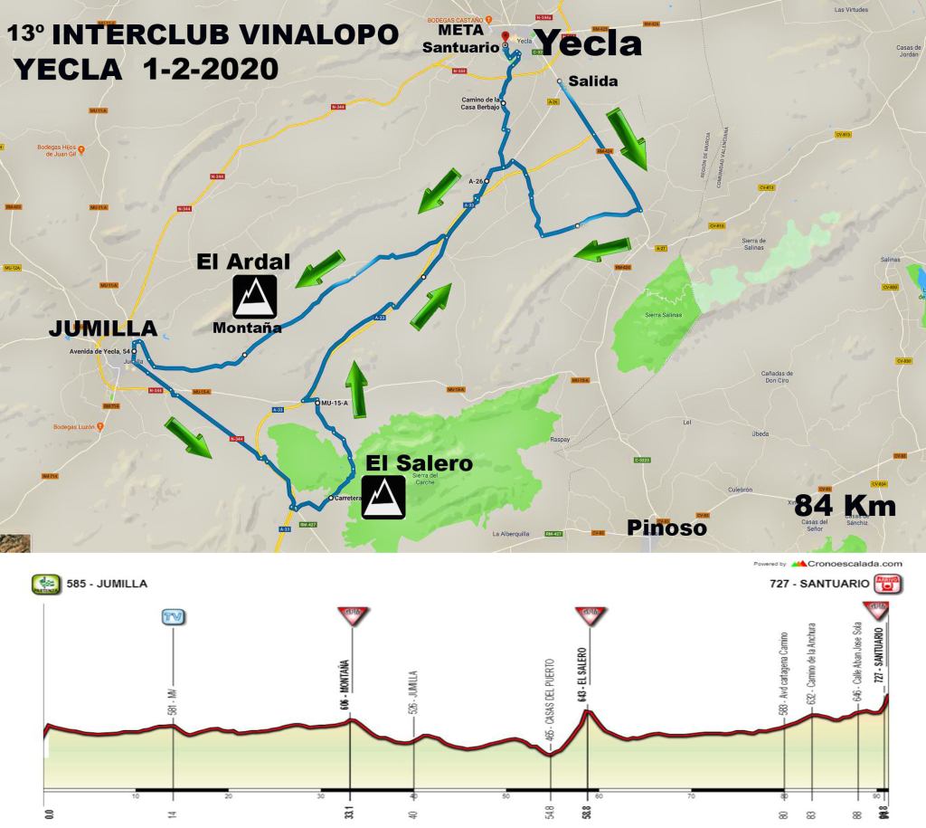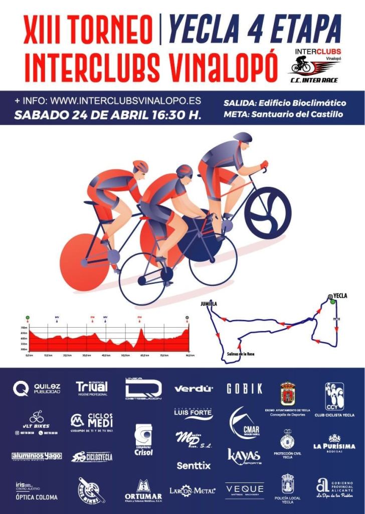 Yecla y Novelda acogerán este fin de semana la cuarta y quinta etapa del Torneo Interclubes Vinalopó que lidera Carlos Martin Bonet, del Ijes solar – Puertas Castalla, tras las pruebas disputadas en Benferri, Elda y Castalla. El sábado, a partir de las 16.30 horas, la carrera se disputa en Yecla con un recorrido de 84 kilómetros. La salida será en el edificio Bioclimático y llegada está estimada sobre las 18:30 en el Santuario del Castillo. RELACIÓN DE INSCRITOS EN YECLA (Fuente. Ciclismo Levante)