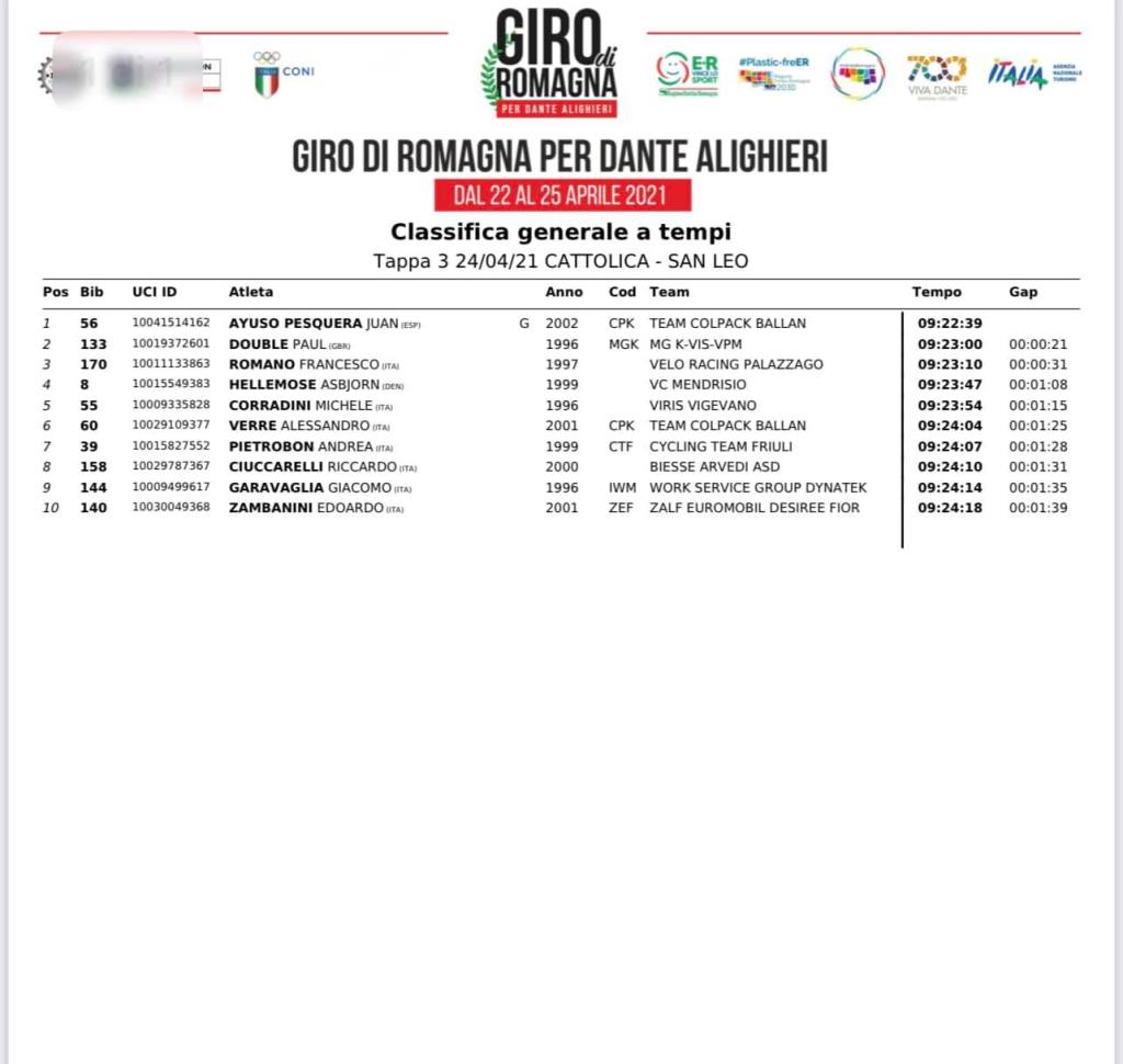 Juan Ayuso (Colpack Team) ha vuelto a ganar en el Giro di Romagna. Hoy se ha adjudicado la tercera etapa, ayer venció en la segunda, disputada entre Cattolica y San Leo. Paul Double ha sido segundo y Michele Corradini (Viris Vigimano), tercero. El xabiense se ha situado como líder de la ronda italiana a falta de una jornada, la que se disputará mañana de 154 kilómetros, con salida y llegada en Ravenna. Ayuso supera en 21 segundos a Paul Double (MG K-Vis) y en 31, al hasta ahora líder, Francesco Romano (Velo Racing).