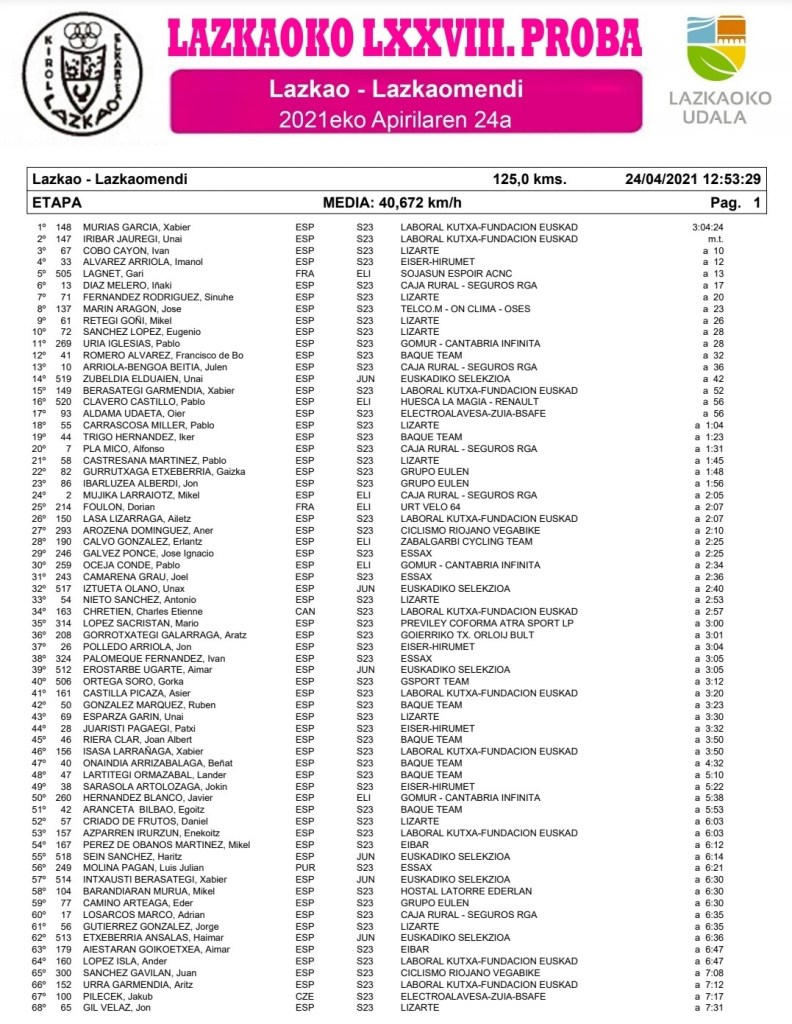 El vizcaíno Xabier Murias ha ganado la Lazkaoko Proba, octava prueba del Torneo Abiatzen de la Federación Vasca de ciclismo, entrando en meta de la mano de su compañero de equipo y ganador hace unos días en Durana, Unai Iribar (Laboral Kutxa). Tercero ha sido Iván Cobo (Lizarte) y cuarto, Imanol Álvarez (Eiser Hirumet), que continúa siendo el líder del Torneo.