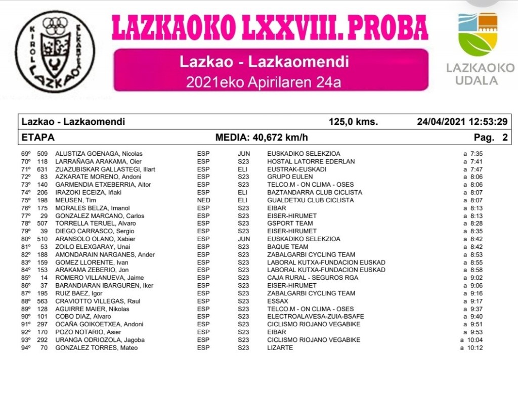 La carrera ha sido muy disputada, con un fuerte ritmo en cabeza que no ha permitido que se formaran grandes escapadas. Al final, en el puerto de Abaltzisketa, se ha formado un grupo cabecero de 20-25 unidades que en la subida final a Lazkaomendi se ha ido disgregando, con dominio de los Laboral Kutxa que han conseguido firmar un doblete en meta.