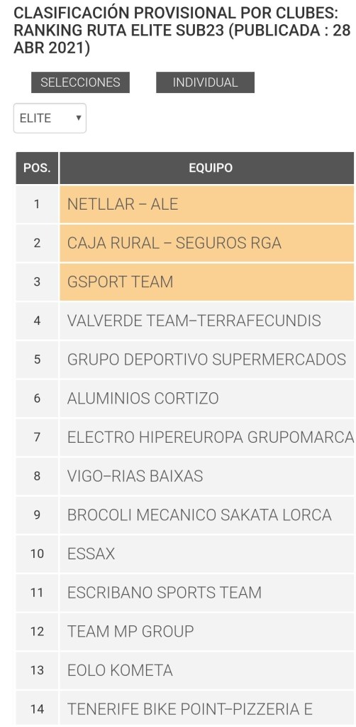 El equipo Netllar Alé lidera el ranking de escuadras élite de la Federación Española de Ciclismo (RFEC) que acaba de hacerse oficial esta mañana tras la disputa de once pruebas puntuables. Los alcoyanos suman en estos momentos 714 puntos, por los 655 del filial del Caja Rural, que es segundo, y los 550 del Gsport de Josué Gómez y Mario Granero. Los sajeños del Grupo Essax, debutantes en la categoría, son décimos con 235.