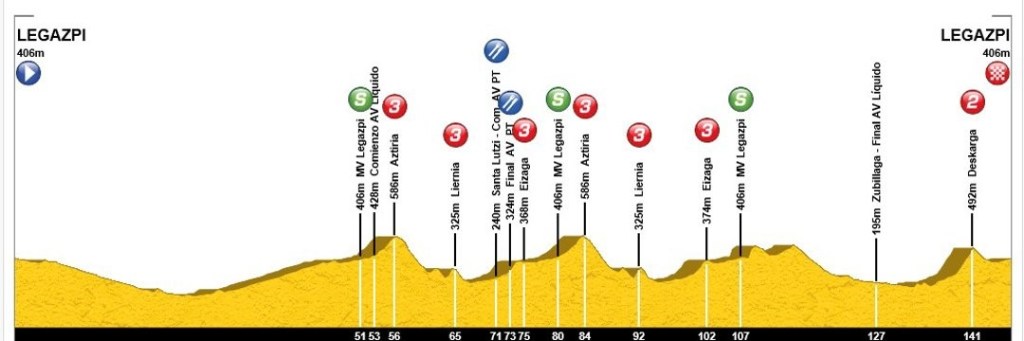 El sábado, día 1 de mayo, regresa la Copa de España élite y sub 23 con la disputa en Legazpi de la 87ª edición de la Santikutz Klasika. El pelotón tendrá delante 146 kilómetros de recorrido y nada menos que once cotas puntuables, lo que demuestra el nivel de exigencia tan alto de la carrera vasca. Inicialmente, en el camino estarán el alto de Azkarate (3ª categoría-km 25,1), los muros de Aztiria (3ª categoría-km 56,1; 84,4 y 115,6). Luego habrá que superar los altos de Liernia (3ª categoría-km 65,1; 93,4 y 124,6), Eizaga (3ª categoría-km 74,5 y 102,8) , Gabiria (3ª categoría-km 131,3) y Aztiria por la localidad de Minas (2ª categoría-km 140,5).