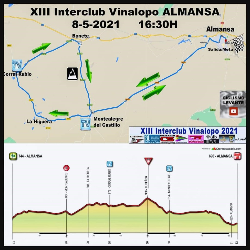 El XIII Torneo Interclubs Vinalopó vive el sábado un nuevo capítulo. Tras la espectacular etapa de Villena con victoria de Julio Alberto Amores, marcada por el fuerte desnivel y una participación de lujo, llega la de Almansa. A partir de as 16.30 horas partirá el pelotón desde la calle Galileo, junto al campo de fútbol, lugar en el que también estará situada la línea de meta, con la intención de recorrer los 85 kilómetros que ha diseñado la PC El Cacho. Montealegre del Castillo, Corral Rubio y Bonete estarán en el camino así como carreteras de la prueba de la Copa de España Élite y Sub 23 de Ontur que se disputará en estos lares el próximo 11 de julio. El viento puede ser el gran protagonista de la jornada y los corredores deberán estar muy atentos a los abanicos.
