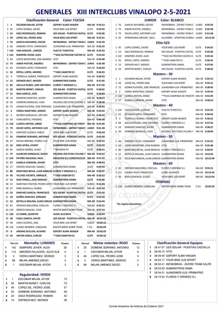 Aitor Escobar es el líder de la general y primer M30; David López (Your Bike), comanda la clasificación de los élites; Óscar García (Infinobras), la de los júniors; Jurgen Van Goolen (Vuelta Turística), en M40; Fernando Gimeno (Juan Giner), en M50; Pascual Orengo (Flores y Orengo), en M60; y Carolina Juárez, en féminas (Mister Biker). El Vito es el mejor equipo, Álex Sempere lleva el maillot de la montaña, Antonio Domene (Ijes Solar) el de la metas volantes y Aitor Escobar el de la regularidad.
