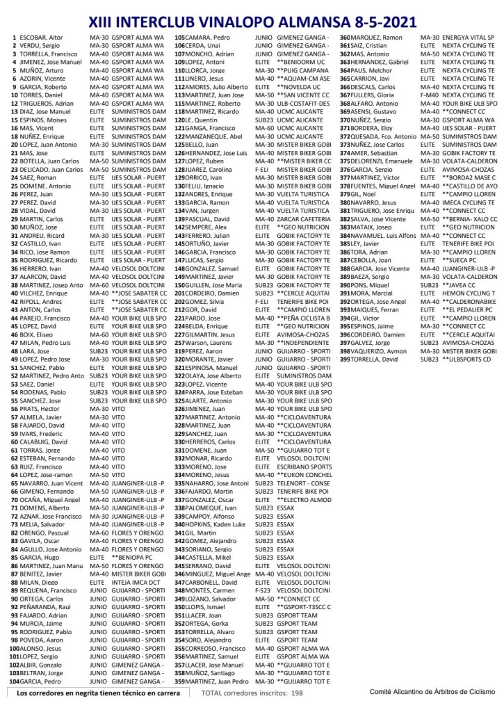 Entre los 198 inscritos figuran los ciclistas del Equipo Essax Iván Palomeque, Alfonso Campoy, Kaden Luke Hopkins, Martín Gil, Alejandro Gómez, Sergio Soriano y Mikel Castellá. Tampoco faltan a la cita las escuadras juveniles de la provincia de Alicante, que también tienen carrera el domingo en Dénia.