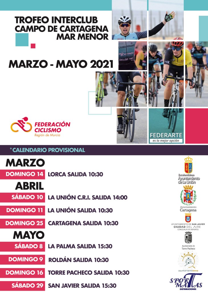 El XXXI Trofeo lnterclub Campo de Cartagena Mar Menor regresa este fin de semana a la competición con dos pruebas. La quinta etapa se disputará el sábado con salida y meta en La Palma. El pelotón partirá a las 15.30 horas y tendrá por delante 84 kilómetros de recorrido. Y la sexta, se disputará el domingo en Roldán. Los ciclistas saldrán a las 10.30 horas para hacer 79 kilómetros en un circuito semiurbano. LISTA DE INSCRITOS