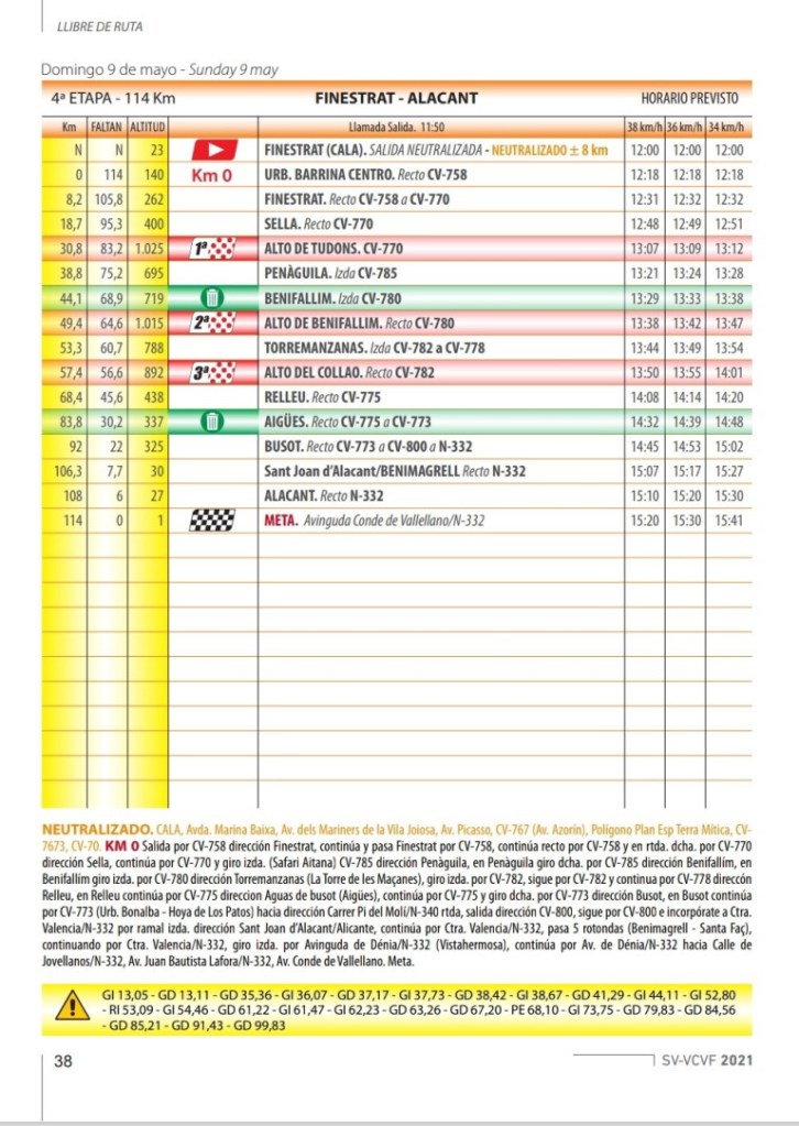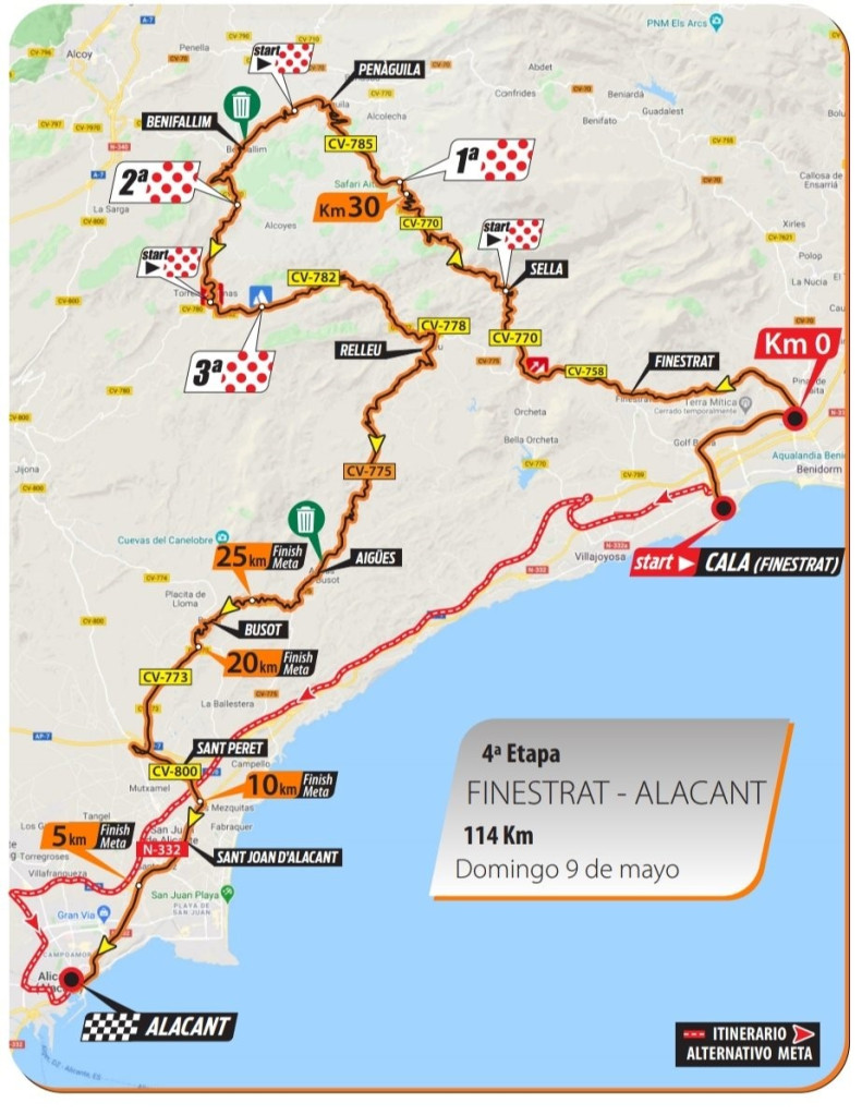 Y la cuarta y última etapa de esta edición de la Setmana Valenciana se disputará en la provincia de Alicante. Las corredoras deberán completar un recorrido de 114 km entre Finestrat y Alicante. Saldrán a las 12 del mediodía desde la Cala de Finestrat, junto al Mar Mediterráneo. Los primeros kilómetros discurrirán por Finestrat y Sella, en la Marina Baixa, antes de afrontar el alto de Tudons, de primera categoría.