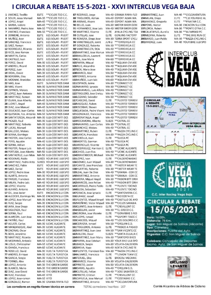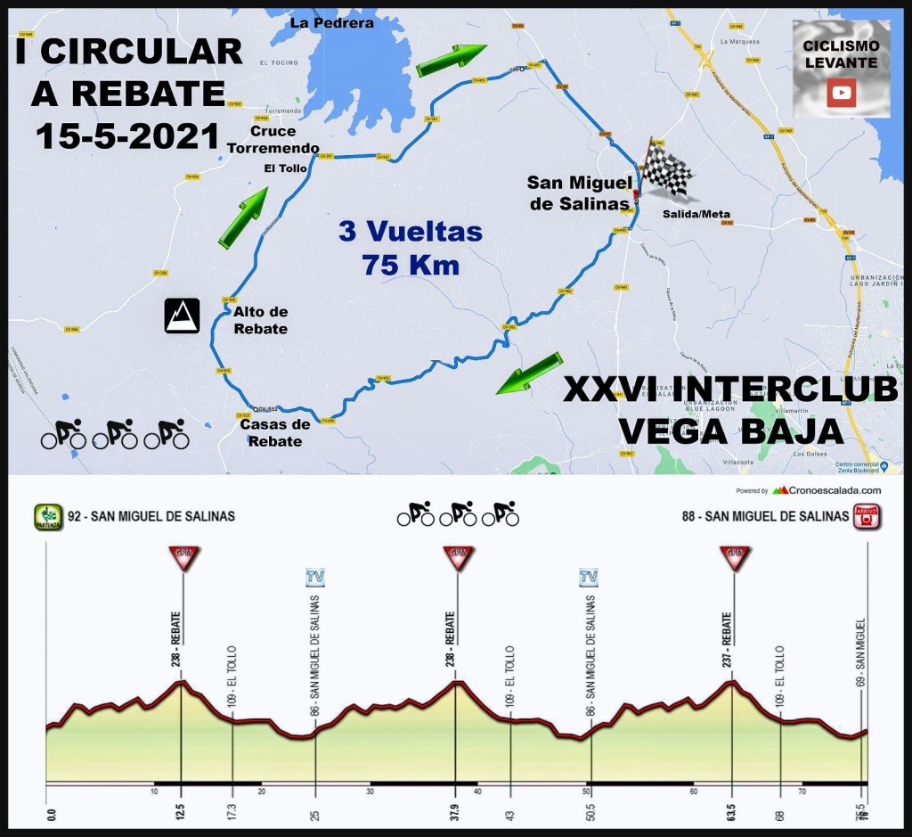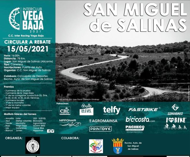 La nueva edición del Interclub Ciclismo Vega Baja ya esta aquí tras las restricciones provocadas por la pandemia del Covid 19 y el sábado comienza en San Miguel de Salinas el Torneo con la disputa de la primera edición del I Circular a Rebate. La prueba, de 78 kilómetros de recorrido, comenzará a las 16 horas. Será la primera prueba de las ocho que ha diseñado CC Inter-Racing Vega Baja. Este es el calendario que se ha fijado: San Miguel de Salinas (15-5-2021), Torrevieja (23-5-2021), Catral (5-6-2021), Benferri (12-6-2021), Cox (11-7-2021), Albatera 25-7-2021), Almoradí (1-8-2021) y Callosa de Segura (8-8-2021).