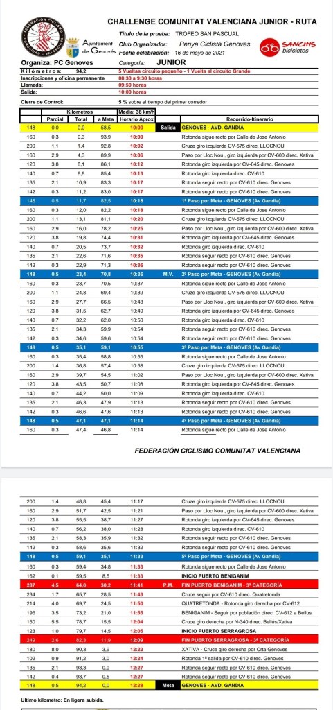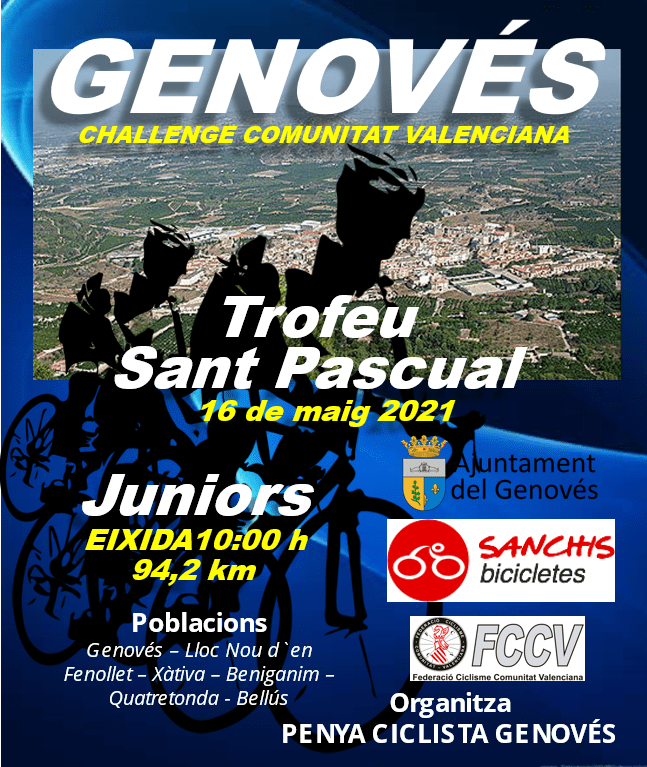 El l Trofeo Sant Pascual, prueba reservada a la categoría junior y puntuable para la Challenge de la Comunitat Valenciana, se disputará el domingo, 16 de mayo, a partir de las 10 de la mañana, sobre un recorrido de 94,2 kilómetros y estará organizada por la PC Genovés. Se darán cinco vueltas a un circuito pequeño, de 11,7 kilómetros, y una a otro más grande, de 35,1, en el que el pelotón deberá ascender los puertos de tercera categoría de Beniganim (Km. 64) y Serragosa (Km. 82,3).