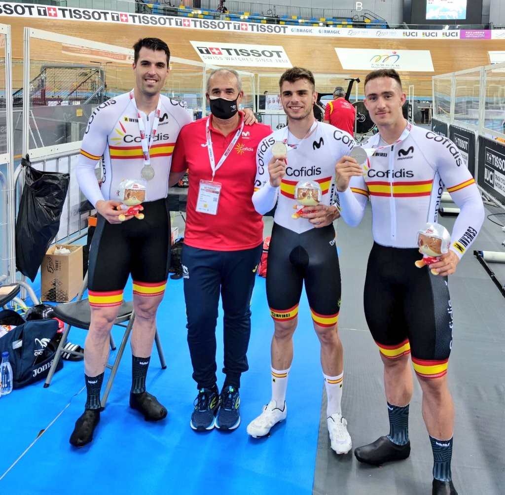 El pistard alicantino logra junto a Juan Peralta y Ekain Jiménez el segundo puesto en el podio en la prueba de velocidad por equipos